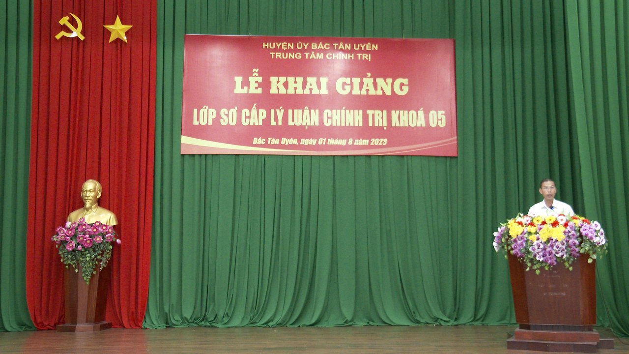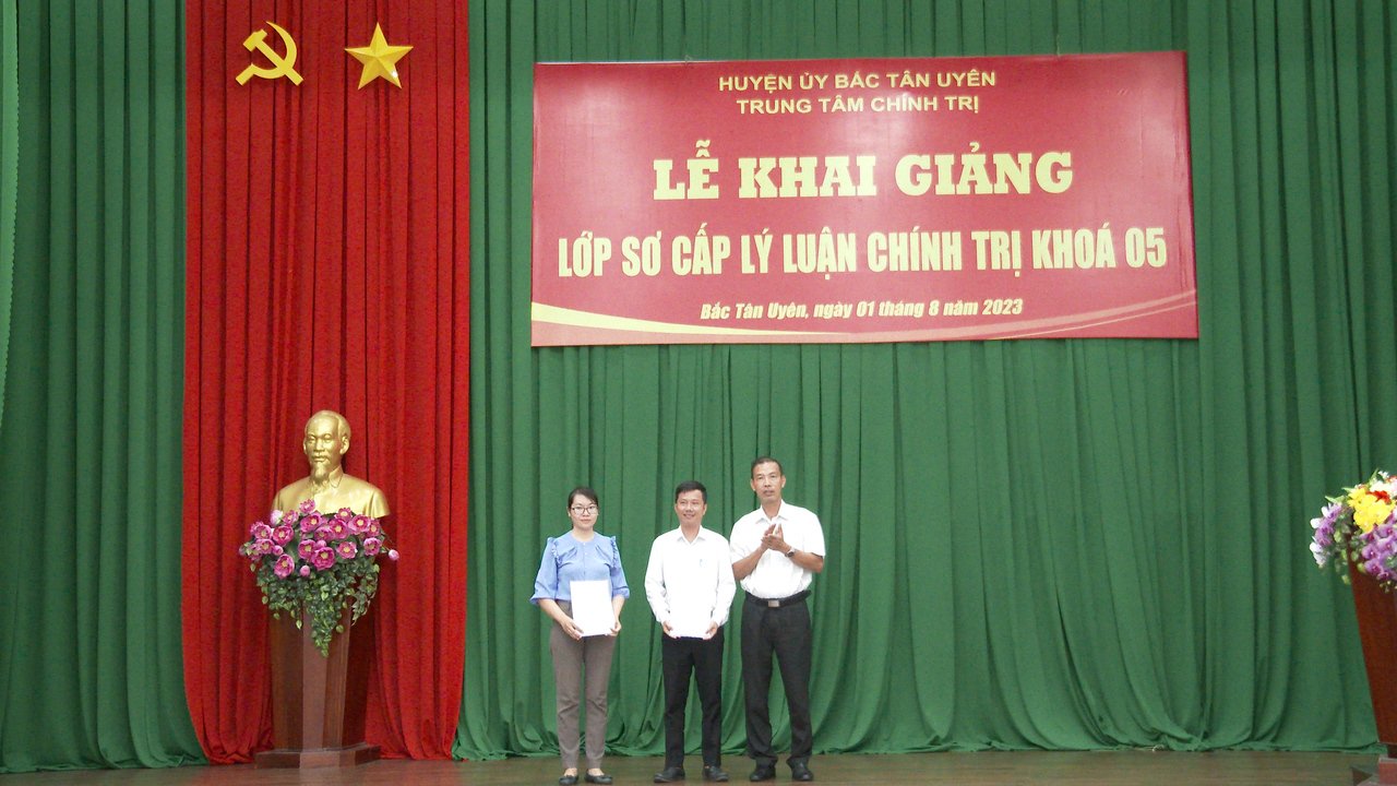 Sáng ngày 01/8, Trung tâm Chính trị huyện Bắc Tân Uyên khai giảng lớp Sơ cấp lý luận chính trị khóa 5 năm 2023. Dự lễ khai giảng có ông Lưu Hữu Duyên-UVTV-Trưởng Ban Tuyên giáo Huyện ủy-Giám đốc Trung tâm chính trị huyện, ông Nguyễn Văn Quân-Phó ban Tổ chức Huyện ủy, bà Hồ Thị Liễu-Phó Giám đốc Trung tâm chính trị huyện, cùng 112 học viên là cán bộ, đảng viên, viên chức các cơ quan, xã, thị trấn của huyện, lãnh đạo các xã, thị trấn, cơ quan có học viên tham gia lớp học.