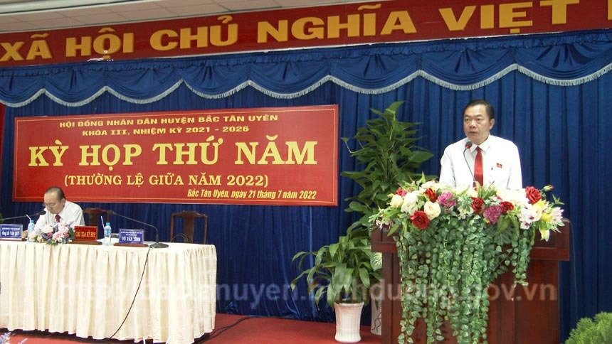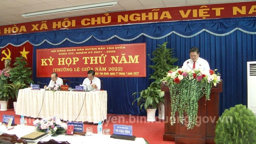 Sáng ngày 21-7, HĐND huyện Bắc Tân Uyên khóa III, nhiệm kỳ 2021- 2026 tiến hành khai mạc Kỳ họp thứ 5 để đánh giá tình hình thực hiện nhiệm vụ phát triển kinh tế - xã hội 6 tháng đầu năm và triển khai nhiệm vụ, giải pháp 6 tháng cuối năm 2022. Ông Võ Văn Tính - Phó Bí thư Thường trực Huyện ủy, Chủ tịch HĐND huyện và Ông Lê Văn Quý - Phó Chủ tịch HĐND huyện điều hành kỳ họp. Tham dự kỳ họp có ông Thái Thanh Bình - Bí Thư Huyện ủy, Chủ tịch UBND huyện; ông Phạm Văn An - Trưởng Ban dân vận Huyện ủy, Chủ tịch UBMTTQVN huyện cùng các ông, bà đại diện các cơ quan, ban, ngành, đoàn thể của huyện; lãnh đạo các xã, thị trấn và các đại biểu HĐND huyện.