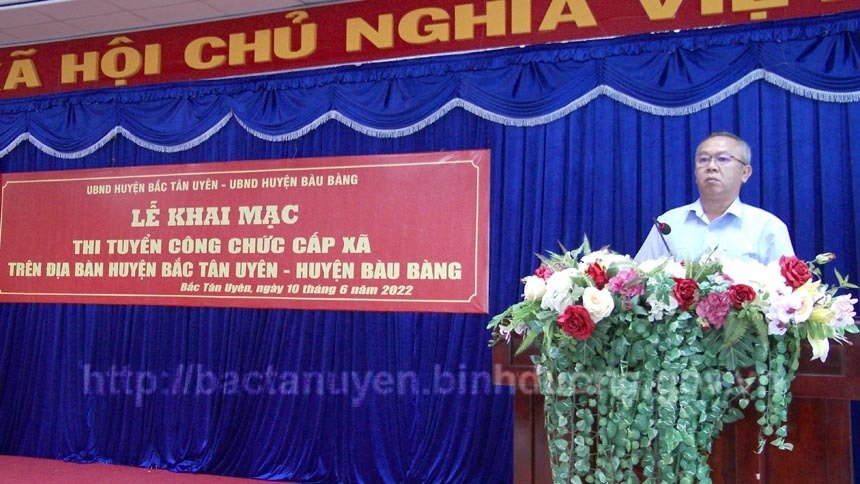 Sáng ngày 10-6, tại Hội trường UBND huyện Bắc Tân Uyên diễn ra Lễ khai mạc kỳ thi tuyển công chức cấp xã trên địa bàn huyện Bắc Tân Uyên và huyện Bàu Bàng năm 2022. Dự lễ khai mạc có ông Thái Thanh Bình - Bí thư Huyện ủy, Chủ tịch UBND huyện Bắc Tân Uyên, Chủ tịch Hội đồng tuyển dụng công chức cấp xã huyện Bắc Tân Uyên và huyện Bàu Bàng; đại diện Sở Nội vụ tỉnh; Lãnh đạo Phòng Nội vụ và các thí sinh của huyện Bắc Tân Uyên và huyện Bàu Bàng.