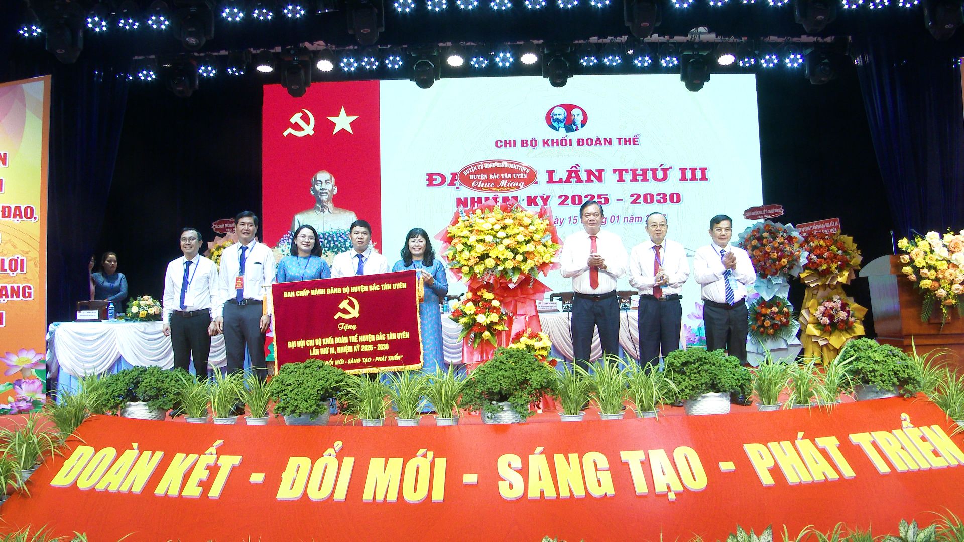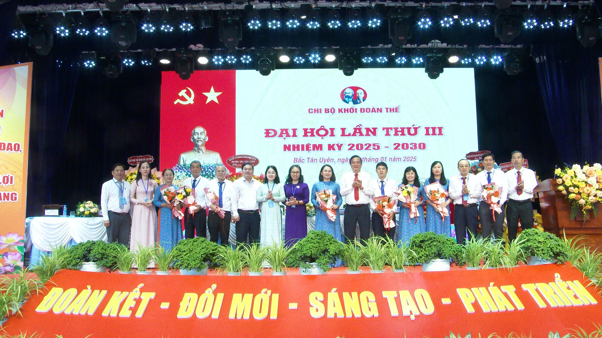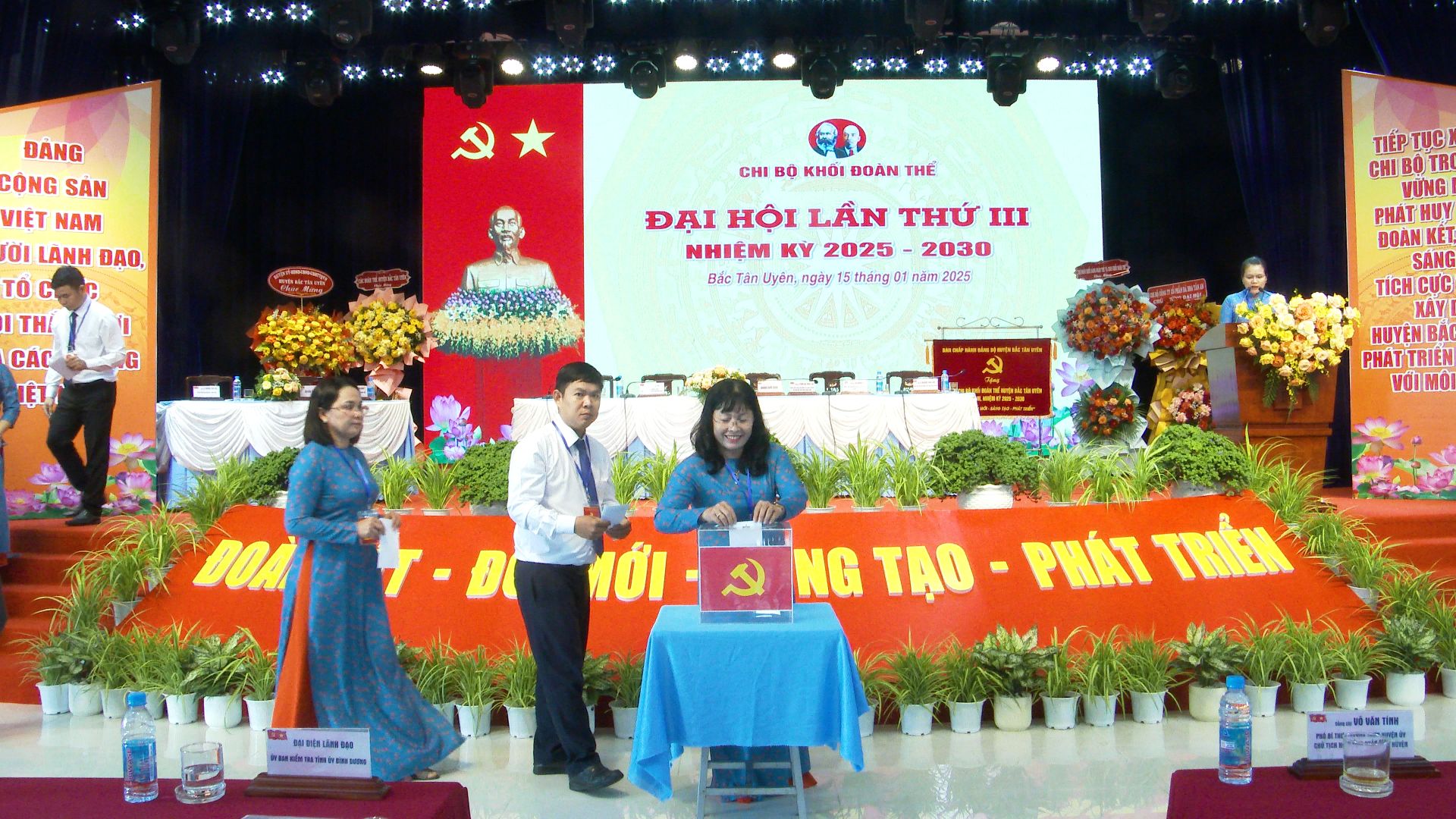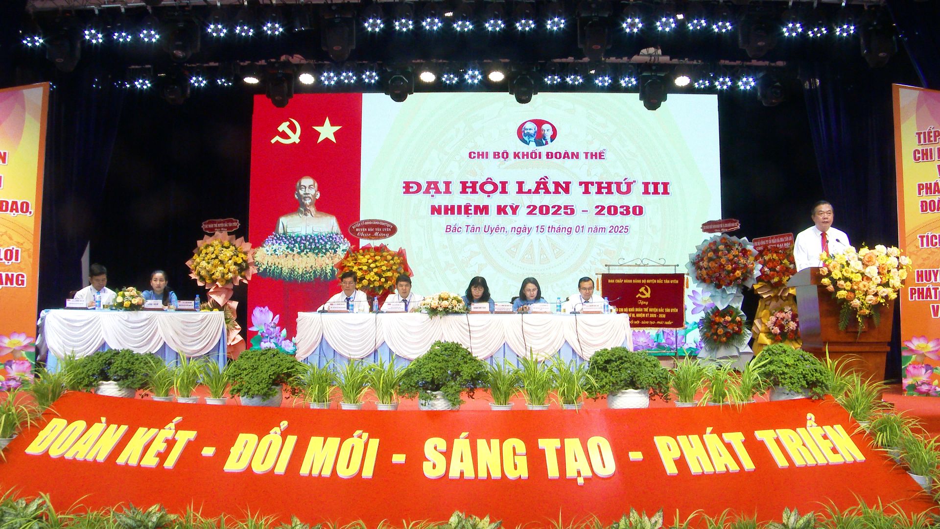 Sáng ngày 15/1, khối Đoàn thể huyện Bắc Tân Uyên tổ chức Đại hội chi bộ lần thứ III, nhiệm kỳ 2025-2030. Đây là chi bộ được Huyện ủy chọn tổ chức Đại hội chi bộ điểm để rút kinh nghiệm cho các chi bộ trong toàn huyện. Đến dự Đại hội có đồng chí Nguyễn Kim Loan-Tỉnh ủy viên-Phó Chủ nhiệm Thường trực Ủy ban Kiểm tra Tỉnh ủy; đồng chí Lê Thị Mộng Diễm-Phó Trưởng ban Tuyên giáo Tỉnh ủy; đồng chí Võ Văn Tính-Phó Bí thư Thường trực Huyện ủy-Chủ tịch HĐND huyện, đồng chí Lê Văn Quý-Ủy viên ban Thường vụ Huyện ủy-Phó Chủ tịch HĐND huyện, đồng chí Phạm Văn An-Ủy viên ban Thường vụ Huyện ủy-Trưởng ban Dân vận Huyện ủy, đồng chí Lưu Hữu Duyên-Ủy viên ban Thường vụ Huyện ủy-Trưởng ban Tuyên giáo Huyện ủy, đồng chí Nguyễn Thanh Lâm-Ủy viên ban Thường vụ Huyện ủy-Trưởng Ban Tổ chức Huyện ủy, đồng chí Huỳnh Văn Thọ-Ủy viên ban Thường vụ Huyện ủy-Chủ nhiệm Ủy ban Kiểm tra Huyện ủy, đồng chí Trần Văn Phương-Ủy viên ban Thường vụ Huyện ủy-Phó Chủ tịch UBND huyện; đồng chí Lê Huỳnh Lê-Ủy viên ban Thường vụ Huyện ủy-Chủ tịch Ủy ban MTTQ Việt Nam huyện, Bí thư các chi bộ trực thuộc Huyện ủy.