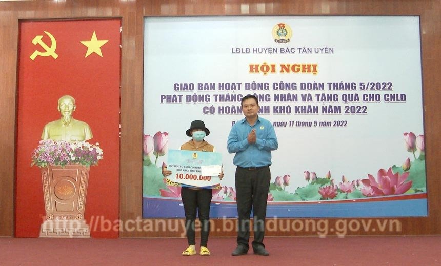 Sáng 11-5, Liên đoàn lao động huyện Bắc Tân Uyên tổ chức Hội nghị giao ban hoạt động Công đoàn tháng 5, phát động Tháng Công nhân và tặng quà cho công nhân lao động có hoàn cảnh khó khăn năm 2022. Dự hội nghị có ông Trần Hữu Phúc - Chủ tịch Liên đoàn lao động huyện; bà Nguyễn Thị Kim Cúc - Phó Chủ tịch LĐLĐ huyện cùng hơn 100 công đoàn viên và công nhân lao động thuộc các Công đoàn Công ty trong toàn huyện.