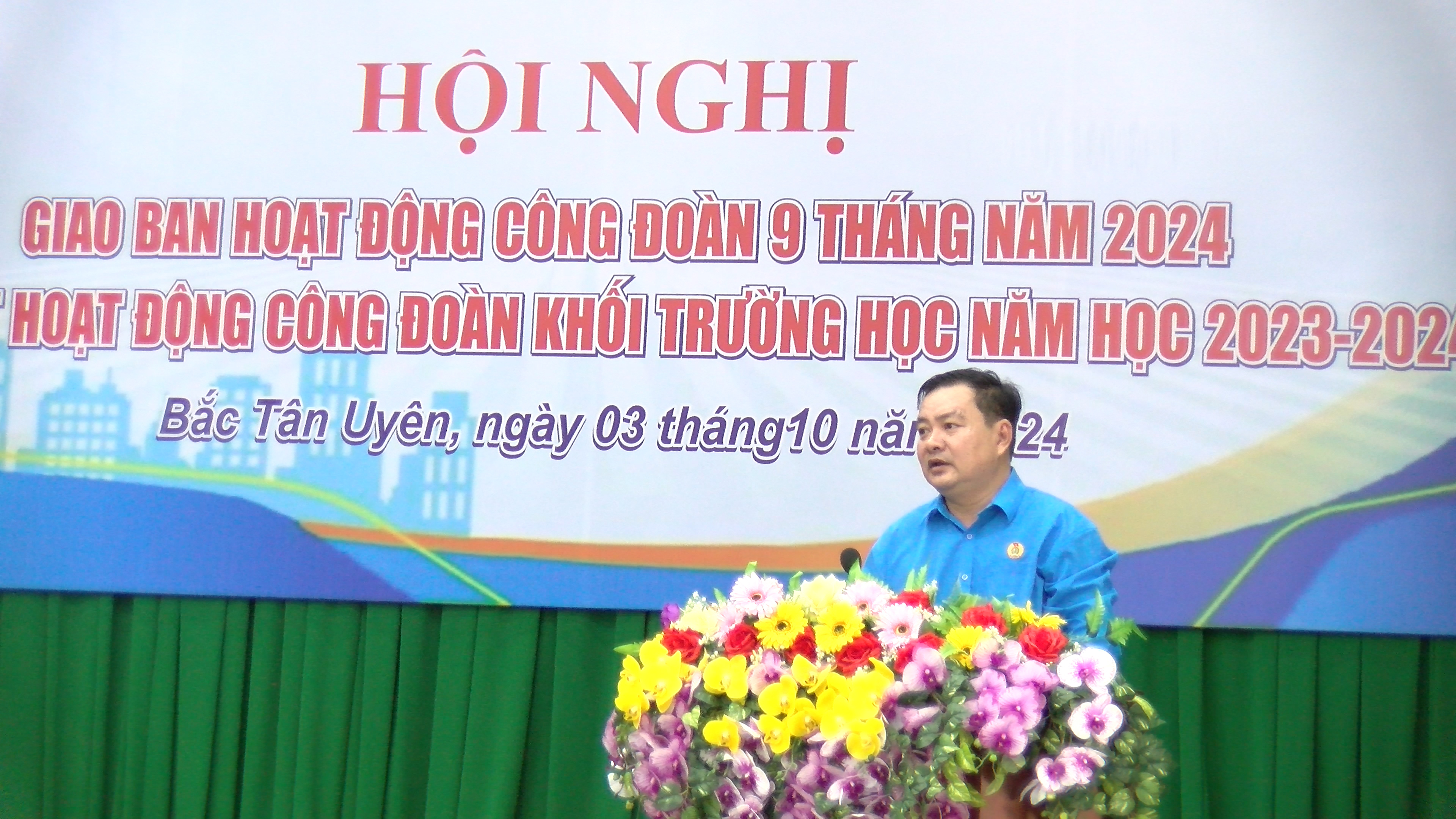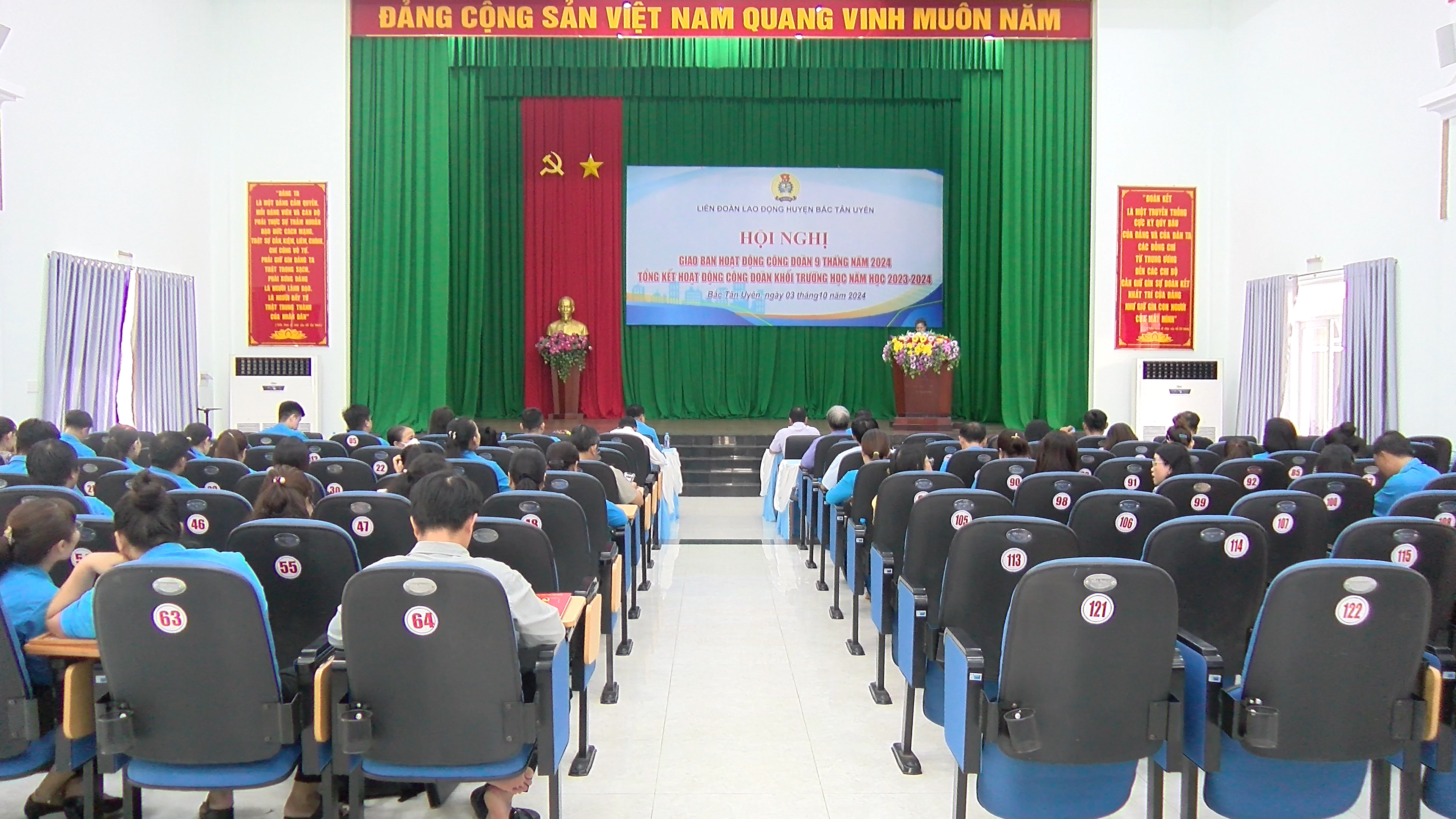 Sáng ngày 3/10, Liên Đoàn lao động huyện Bắc Tân Uyên tổ chức hội nghị giao ban hoạt động công đoàn 9 tháng đầu năm và tổng kết hoạt động công đoàn khối trường học năm học 2023-2024. Dự hội nghị có đồng chí Phạm Văn An - Uỷ viên Ban thường vụ Huyện uỷ, Trưởng Ban dân vận; đồng chí Trần Hữu Phúc - Huyện uỷ viên, Chủ tịch Liên đoàn lao động huyện và đại diện lãnh đạo các công đoàn cơ sở trực thuộc.