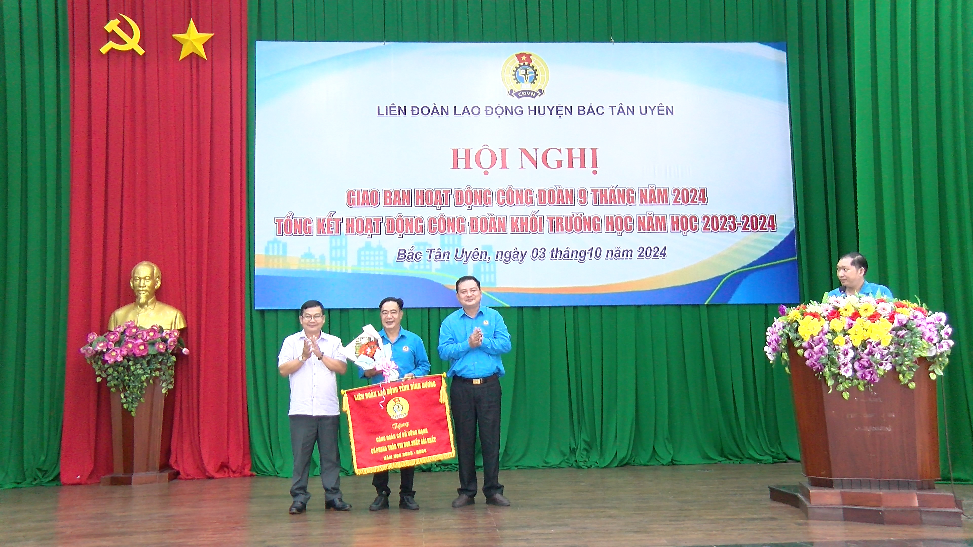 lãnh đạo trao tặng cờ thi đua xuất sắc cho tập thể công đoàn trường TH THCS Tân Định