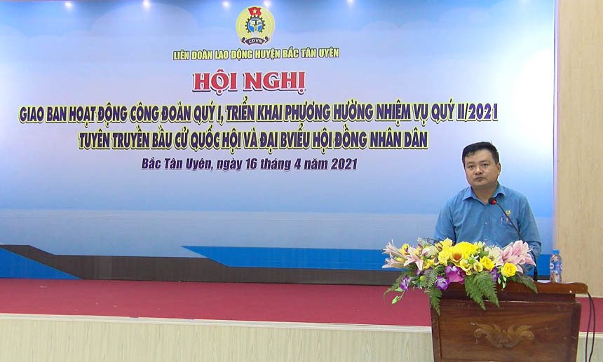 Phát biểu tại hội nghị ông Trần Hữu Phúc - Chủ tịch Liên đoàn Lao động huyện đã ghi nhận, trả lời các ý kiến tham gia phát biểu, đồng chí đề nghị trong thời gian tới các đơn vị cần tập trung đẩy mạnh công tác tuyên truyền, nhất là tuyên truyền về công tác bầu cử Đại biểu Quốc hội khóa XV và HĐND các cấp nhiệm kỳ 2021-2026; tổ chức “Tháng Công nhân” với nhiều hoạt động đảm bảo phù hợp, hiệu quả.