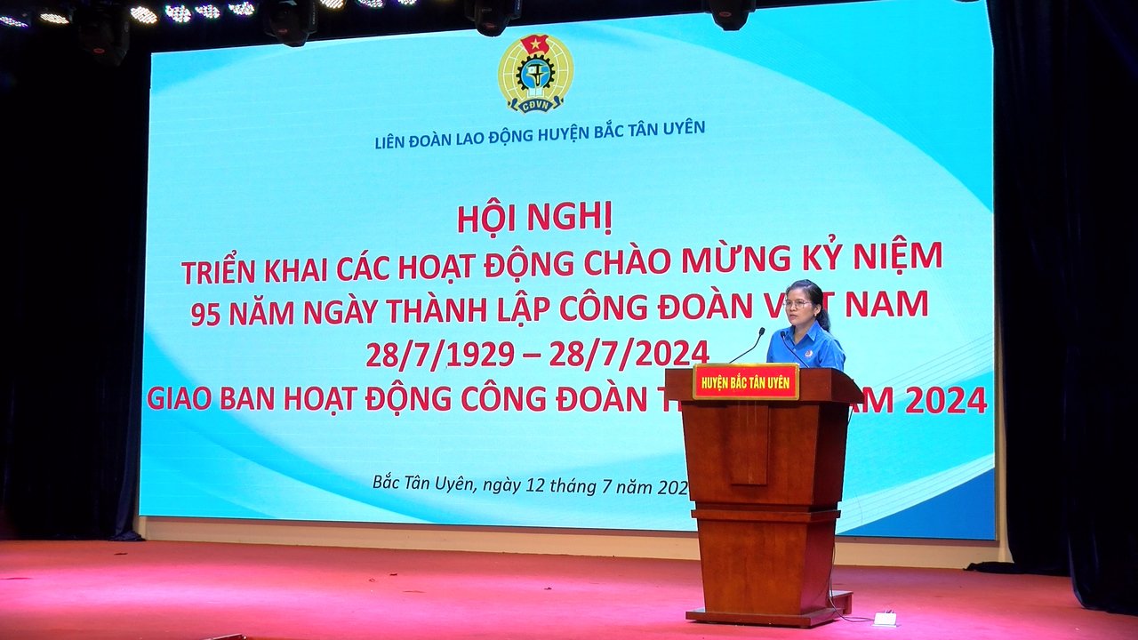 Sáng 12/7, Liên đoàn Lao động huyện Bắc Tân Uyên tổ chức Hội nghị giao ban nhằm đánh giá tình hình, kết quả hoạt động công đoàn trong tháng 7 và triển khai nhiệm vụ trọng tâm tháng 8 năm 2024, đồng thời triển khai các hoạt động chào mừng kỷ niệm 95 năm Ngày thành lập Công đoàn Việt Nam (28/7/1929 - 28/7/2024). Dự hội nghị có bà Nguyễn Thị Kim Cúc - Phó Chủ tịch LĐLĐ huyện cùng Thường trực LĐLĐ huyện và đại diện các CĐCS trực thuộc.