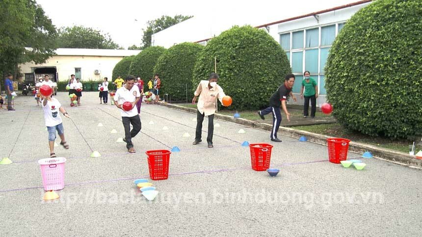 Các gia đình tham gia phần thi “gia đình vui khỏe” nội dung vượt chướng ngại vật ném bóng vào giỏ