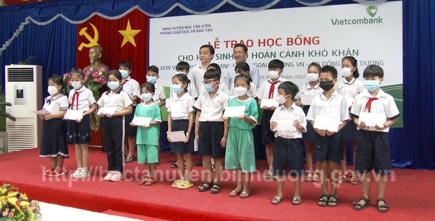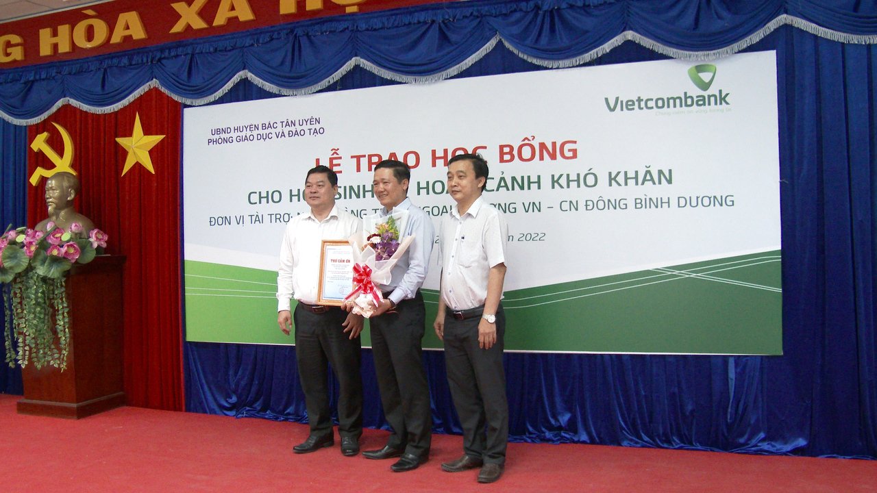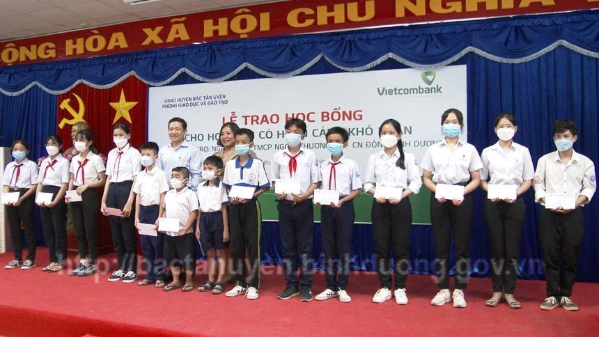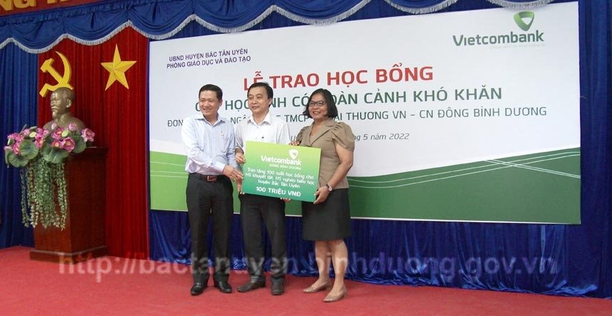 Chiều 24-5, Ngân hàng Vietcombank Chi nhánh Đông Bình Dương phối hợp cùng Phòng Giáo dục và Đào tạo huyện Bắc Tân Uyên tổ chức trao 100 suất học bổng cho các em học sinh có hoàn cảnh khó khăn trên địa bàn huyện năm 2022. Tham dự Chương trình có ông Trần Văn Phương - Phó Chủ tịch UBND huyện; ông Nguyễn Khánh Thắng - Giám đốc Chi nhánh Ngân hàng Vietcombank Đông Bình Dương; ông Nguyễn Tấn Anh - Trưởng phòng Giáo dục và Đào tạo huyện cùng 100 em học sinh có hoàn cảnh khó khăn được nhận học bổng.