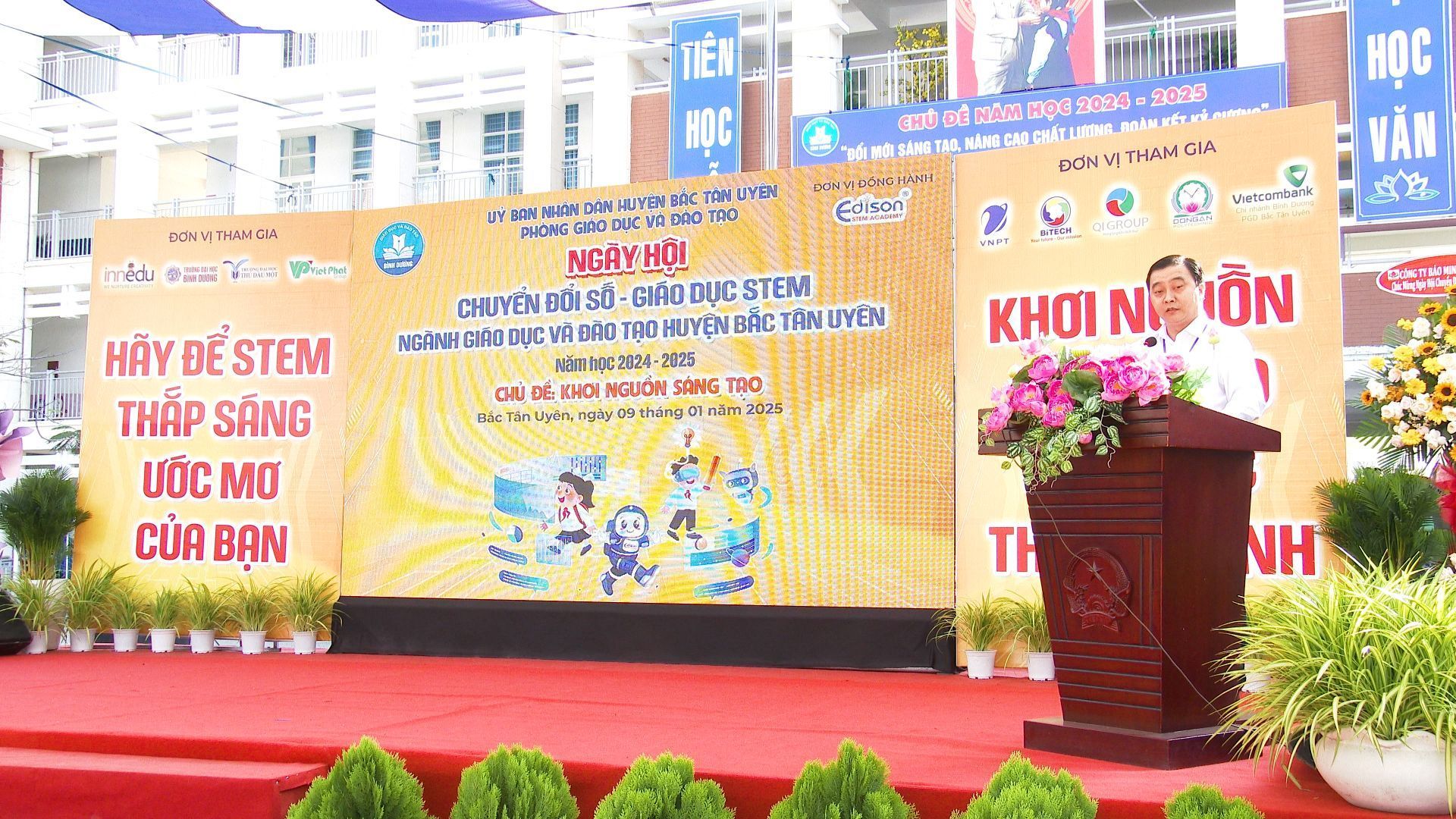 Sáng ngày 9/1, tại trường Tiểu học Tân Thành, Phòng Giáo dục và Đào tạo huyện Bắc Tân Uyên tổ chức Ngày hội chuyển đổi số - giáo dục STEM năm học 2024-2025. Đến dự ngày hội có bà Nguyễn Thị Nhật Hằng-Giám đốc Sở Giáo dục và Đào tạo tỉnh, ông Trần Văn Phương-Ủy viên Ban Thường vụ Huyện ủy-Phó Chủ tịch UBND huyện, bà Nguyễn Thị An Kim-Huyện uỷ viên-Trưởng phòng Văn hóa và Thông tin huyện, thầy Nguyễn Tấn Anh-Huyện ủy viên-Trưởng phòng Giáo dục và Đào tạo huyện, lãnh đạo các phòng, ban ngành, đoàn thể huyện; hiệu trưởng, phó hiệu trưởng, học sinh các trường trên địa bàn huyện; lãnh đạo phòng Giáo dục và Đào tạo các huyện, thành phố, các trường Đại học, các doanh nghiệp hoạt động trong lĩnh vực khoa học - công nghệ trên địa bàn huyện.