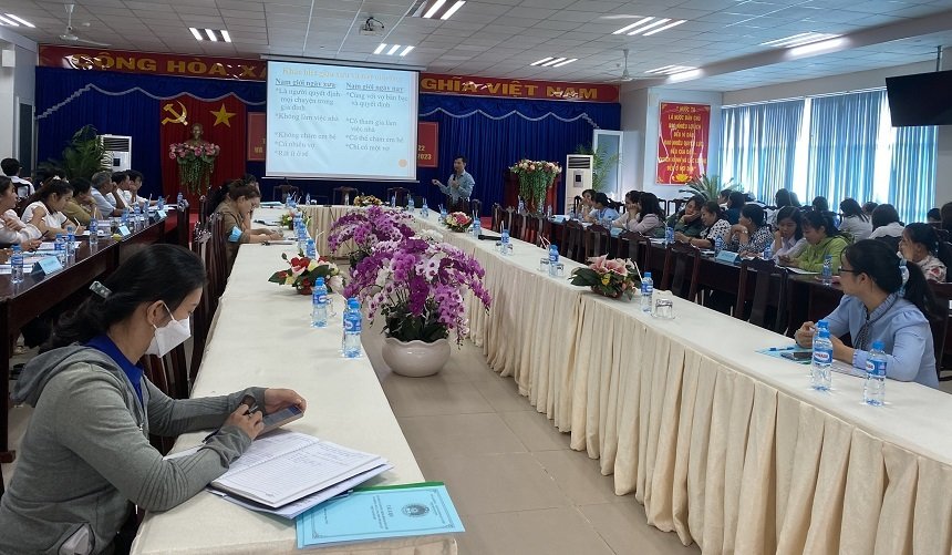 Tham gia lớp tập huấn với hơn 90 đại biểu là thành viên của ban vì sự tiến bộ phụ nữ cấp huyện, cấp xã và cộng tác viên bảo vệ chăm sóc trẻ em, bình đẳng giới khu ấp trên địa bàn huyện.