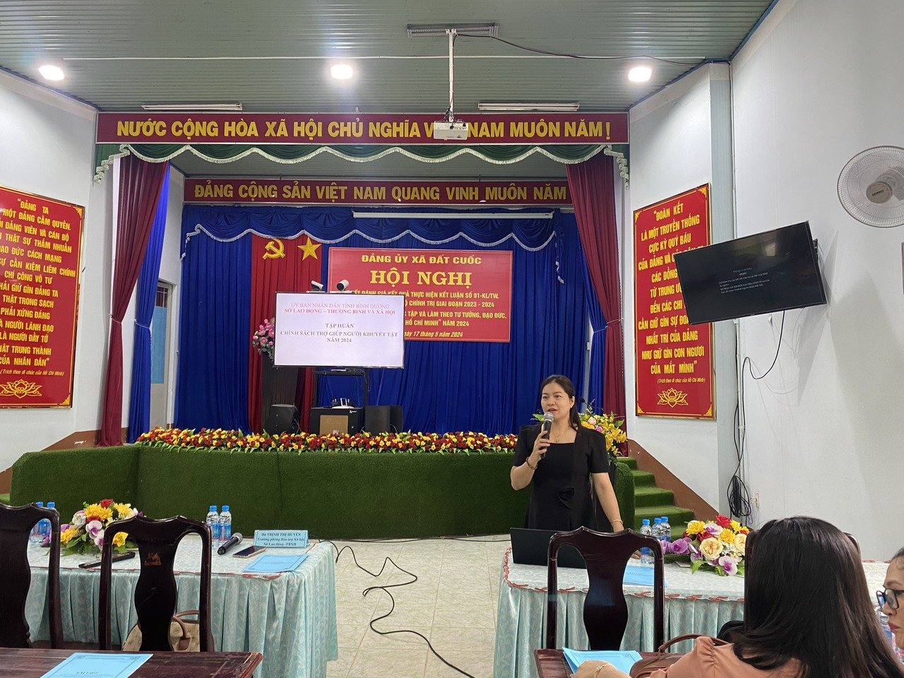 Ngày 21/5, tại Hội trường UBND xã Đất Cuốc, Phòng Lao động - Thương binh và Xã hội huyện phối hợp với Sở Lao động - Thương binh và Xã hội tỉnh Bình Dương tổ chức tập huấn thực hiện đề án hỗ trợ trẻ em khuyết tật tiếp cận các dịch vụ bảo vệ chăm sóc, giáo dục tại cộng đồng trên địa bàn huyện. Đến dự tập huấn có ông Đoàn Quốc Tuấn - Phó Trưởng phòng Lao động - Thương binh và Xã hội huyện Bắc Tân Uyên. Báo cáo viên là bà Trịnh Thị Huyền - Trưởng Phòng Bảo trợ xã hội - Sở Lao động - Thương binh và Xã hội tỉnh Bình Dương.