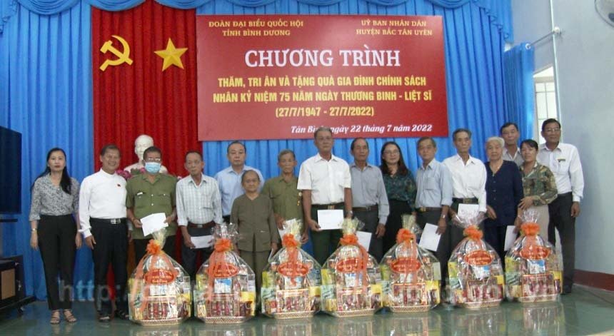 Tại Chương trình, Đoàn đã nghe đơn vị đại diện Lãnh đạo thị trấn Tân Bình báo cáo về kết quả thực hiện chính sách người có công trong thời gian qua, những thuận lợi, khó khăn và đề xuất, kiến nghị. Đồng thời, Đoàn đã trao 3 phần quà của Đoàn Đại biểu Quốc hội tỉnh, 2 phần quà của UBND tỉnh Bình Dương và 7 phần quà của UBND huyện Bắc Tân Uyên đến các thương binh, gia đình chính sách trên địa bàn thị trấn. Được biết trong dịp Kỷ niệm 75 năm Ngày Thương binh Liệt sĩ (27/7/1947-27/7/2022), UBND thị trấn Tân Bình trao 6 phần quà của UBND tỉnh Bình Dương, 36 phần quà của UBND huyện Bắc Tân Uyên và 1 phần quà của Quỹ thiện tâm Tập đoàn VinGroup cho Mẹ Việt Nam anh hùng và các gia đình gia đình chính sách trên địa bàn thị trấn.