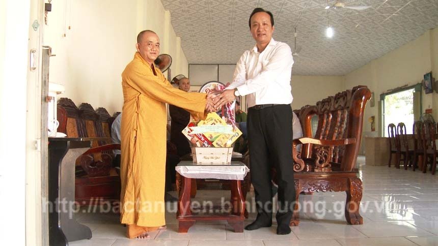 Ông Trương Văn Phong - Phó Bí thư Huyện ủy thăm và chúc mừng Đại Đức Thích Thiện Quang - Trưởng Ban trị sự Giáo hội Phật giáo Việt Nam huyện Bắc Tân Uyên, trụ trì Chùa Bảo Lâm Sơn – xã Tân Định