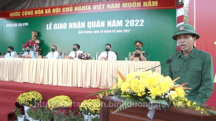 Tại buổi lễ, thay mặt Hội đồng NVQS huyện, thượng tá Lê Văn Toàn, Chỉ huy trưởng, Ban chỉ huy quân sự huyện đã công bố Quyết định của UBND tỉnh, Bộ chỉ huy quân sự tỉnh và Công an tỉnh về chỉ tiêu giao nhận quân của huyện Bắc Tân Uyên năm 2022. Năm nay, huyện Bắc Tân Uyên có 117 tân binh được giao về 5 đơn vị gồm Công an tỉnh Bình Dương, Bộ chỉ huy quân sự tỉnh Bình Dương, Lữ đoàn Đặc công 429-Bộ Quốc phòng; Lữ đoàn Công binh 550-Quân đoàn 4, Sư đoàn bộ binh 5-Quân khu 7. Trong đó có 4 đảng viên trẻ, 100% tân binh là đoàn viên.