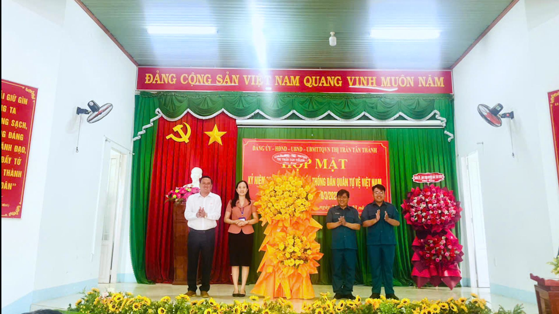 Sáng 27-3, UBND thị trấn Tân Thành tổ chức họp mặt kỷ niệm 90 năm Ngày truyền thống Dân quân tự vệ (DQTV) Việt Nam (28/3/1935 - 28/3/2025). Tham dự buổi họp mặt có Thượng tá Nguyễn Phương Khánh-UVTV huyện ủy, Chỉ huy trưởng ban CHQS huyện; bà Trần Hoài Thu-UVTV huyện ủy, Bí thư Đảng ủy thị trấn cùng các đại diện lãnh đạo các ban ngành, đoàn thể và lực lượng vũ trang trên địa bàn thị trấn.