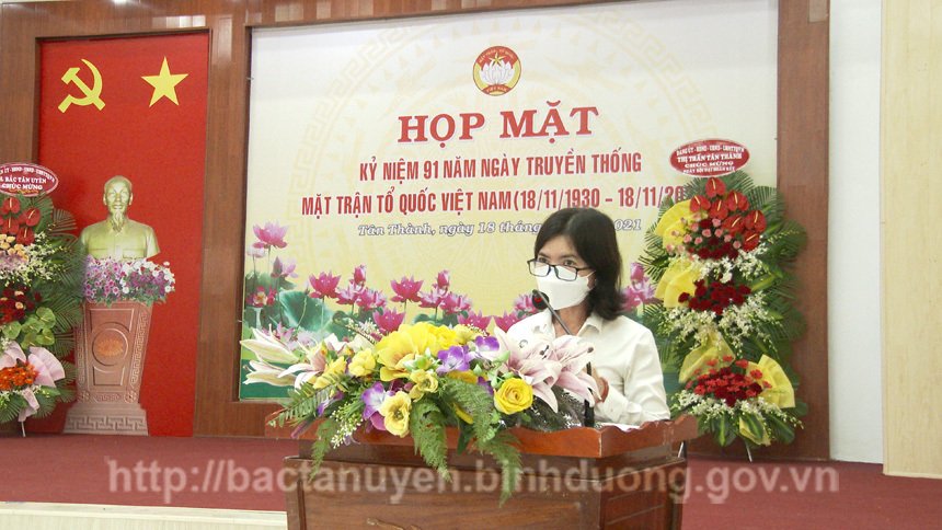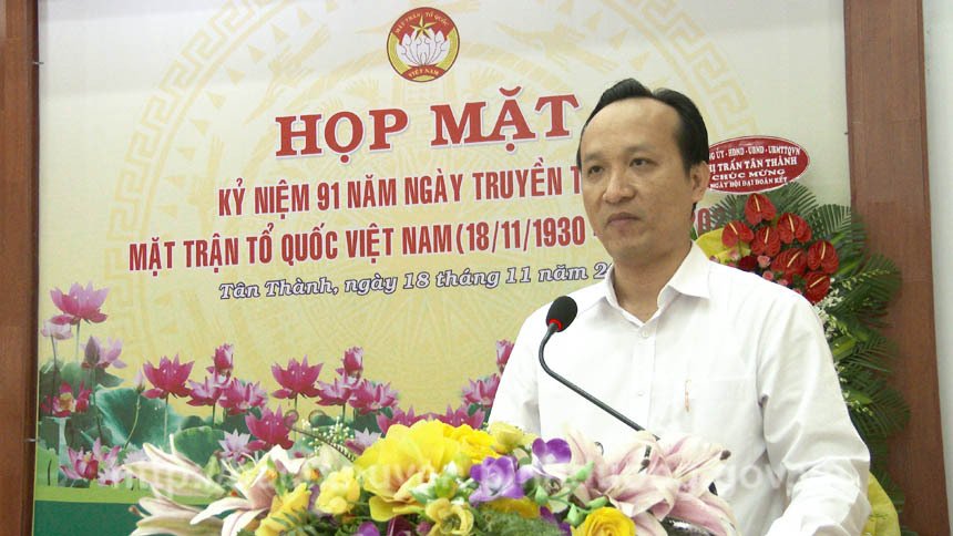 Chiều ngày 18-11, Ban Thường trực Ủy ban Mặt trận Tổ quốc Việt Nam thị trấn Tân Thành tổ chức họp mặt kỷ niệm 91 năm ngày truyền thống MTTQ Việt Nam (18/11/1930-18/11/2021). Đến dự họp mặt có ông Trương Văn Phong – Phó Bí thư Huyện ủy; ông Phạm Văn An – Trưởng Ban Dân vận, Chủ tịch Ủy ban MTTQ huyện; ông Huỳnh Thanh Tuấn – Bí thư Đảng ủy, Chủ tịch HĐND thị trấn; bà Đoàn Thị Ánh Tuyết – Phó Bí thư Đảng ủy, Trưởng Khối vận, Chủ tịch Ủy ban MTTQ thị trấn; bà Nguyễn Lan Anh – Phó Chủ tịch HĐND thị trấn; ông Võ Văn Tuyến – Phó Chủ tịch UBND thị trấn cùng các hộ dân tiêu biểu đại diện cho hơn 1.400 hộ dân trên địa bàn thị trấn.