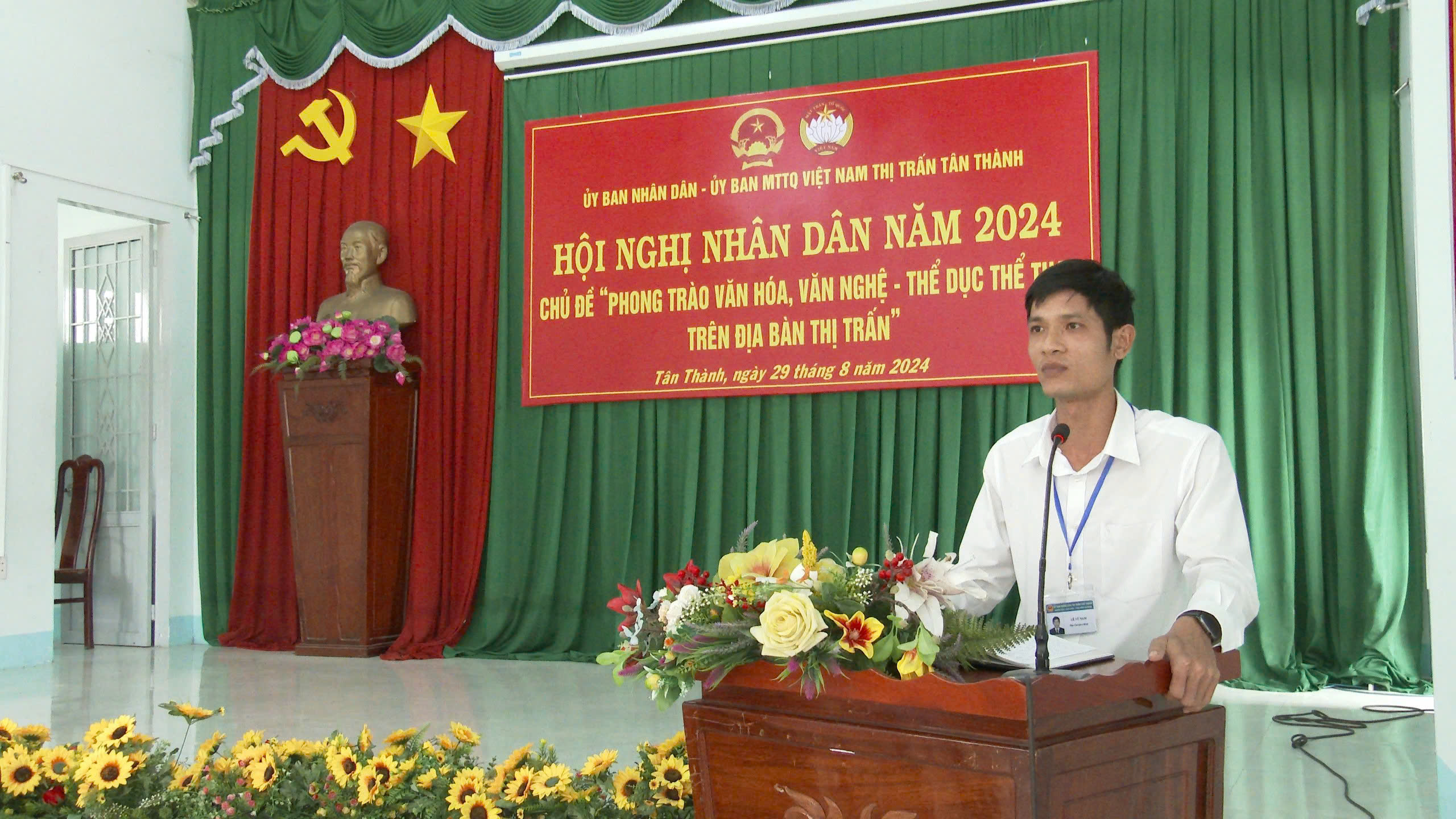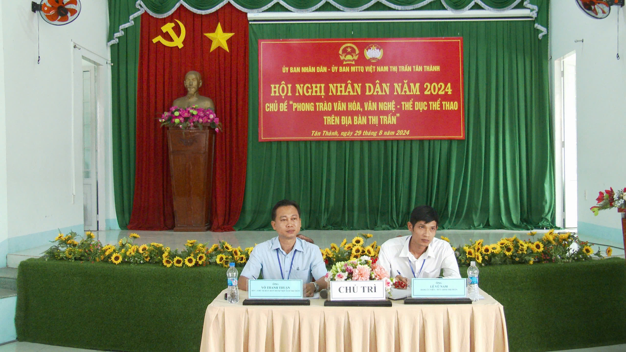 Chiều ngày 29-8, Ủy ban MTTQ Việt Nam thị trấn phối hợp cùng UBND thị trấn tổ chức Hội nghị nhân dân với chủ đề “Hiến kế phát triển phong trào văn hóa, văn nghệ - thể dục thể thao trên địa bàn thị trấn Tân Thành”. Tham dự hội nghị có ông Nguyễn Ánh Linh - Ủy viên thường trực Ủy ban MTTQ Việt Nam huyện; bà Trần Hoài Thu - HUV, Bí thư Đảng ủy thị trấn cùng lãnh đạo các ngành, đoàn thể; Ủy viên UBMTTQ Việt Nam thị trấn nhiệm kỳ 2024 - 2029; Chi bộ, ban điều hành và nhân dân các khu phố trên địa bàn thị trấn.