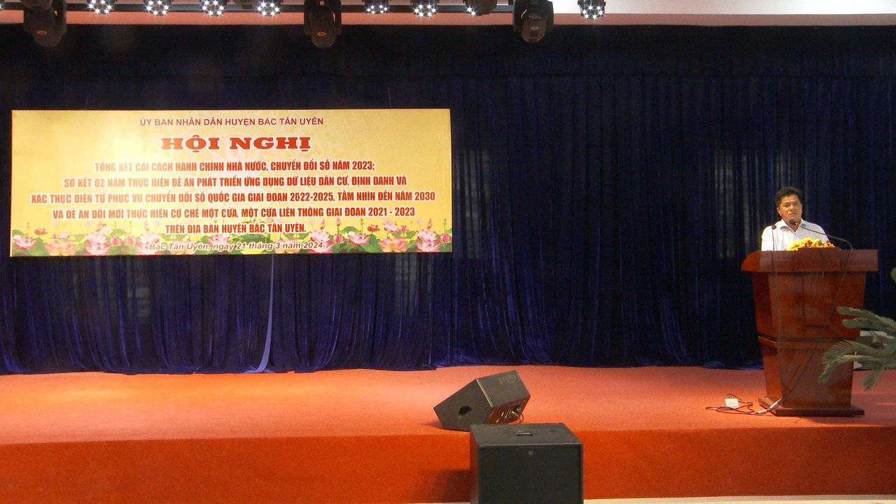 Sáng ngày 21/3, huyện Bắc Tân Uyên tổ chức Hội nghị Tổng kết cải cách hành chính nhà nước, Chuyển đổi số năm 2023; sơ kết 02 năm thực hiện Đề án phát triển ứng dụng dữ liệu dân cư, định danh và xác thực điện tử phục vụ chuyển đổi số quốc gia (Đề án 06 Chính phủ) giai đoạn 2022-2025 và sơ kết Đề án đổi mới thực hiện cơ chế một cửa, một cửa liên thông giai đoạn 2021 – 2023. Dự hội nghị có ông Nguyễn Hữu Yên - Phó Giám đốc Sở Thông tin và Truyền thông tỉnh, ông Nguyễn Thành Thường - Phó Bí thư Huyện ủy - Chủ tịch UBND huyện - Trưởng ban chỉ đạo cải cách hành chính, chuyển đổi số huyện, ông Trần Văn Phương –UVTV - Phó Chủ tịch UBND huyện cùng lãnh đạo các ngành, đoàn thể huyện và các xã, thị trấn.