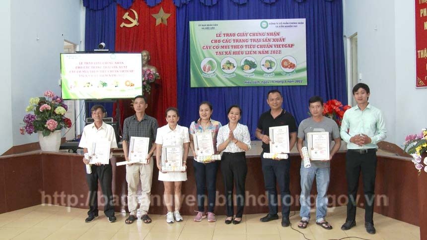 Tại buổi lễ, đại diện Công ty FAO và UBND xã Hiếu Liêm đã triển khai chính sách hỗ trợ thực hành sản xuất nông nghiệp tốt; chính sách hỗ trợ liên kết, tiêu thụ sản phẩm nông nghiệp tỉnh Bình Dương và Chương trình Mỗi xã một sản phẩm (OCOP). Cùng với đó, đại diện Chi cục Trồng trọt và Bảo vệ thực vật tỉnh, Công ty FAO đã trao giấy chứng nhận mới cho 4 cơ sở trên địa bàn xã gồm: Công ty TNHH MTV Trang trại Đồi Xanh, HTX Tổng hợp Ngọc Quang Thanh, Trang trại Lâm Văn Bình, hộ ông Trần Văn Thành - Trang trại Sol Retreat và 3 trang trại thực hiện tái chứng nhận là Trang trại Lâm Thành Tình, Trang trại Nguyễn Trung Thảo, Trang trại Việt Thái. Các cơ sở được nhận 1 giấy chứng nhận VietGAP, 1.000 tem truy xuất nguồn gốc và 1 biển nhận diện vùng sản xuất kích thước 1,2mx2m đặt tại vùng sản xuất của cơ sở.