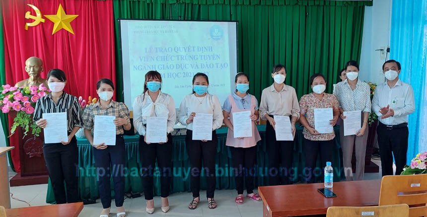 Sáng ngày 01-12, Phòng Giáo dục và Đào tạo huyện Bắc Tân Uyên tổ chức lễ trao Quyết định tuyển dụng viên chức ngành Giáo dục và Đào tạo năm học 2021 - 2022. Dự Lễ trao Quyết định có ông Nguyễn Tấn Anh - Trưởng Phòng GD&ĐT huyện, cùng 17 tân viên chức ngành GD&ĐT.