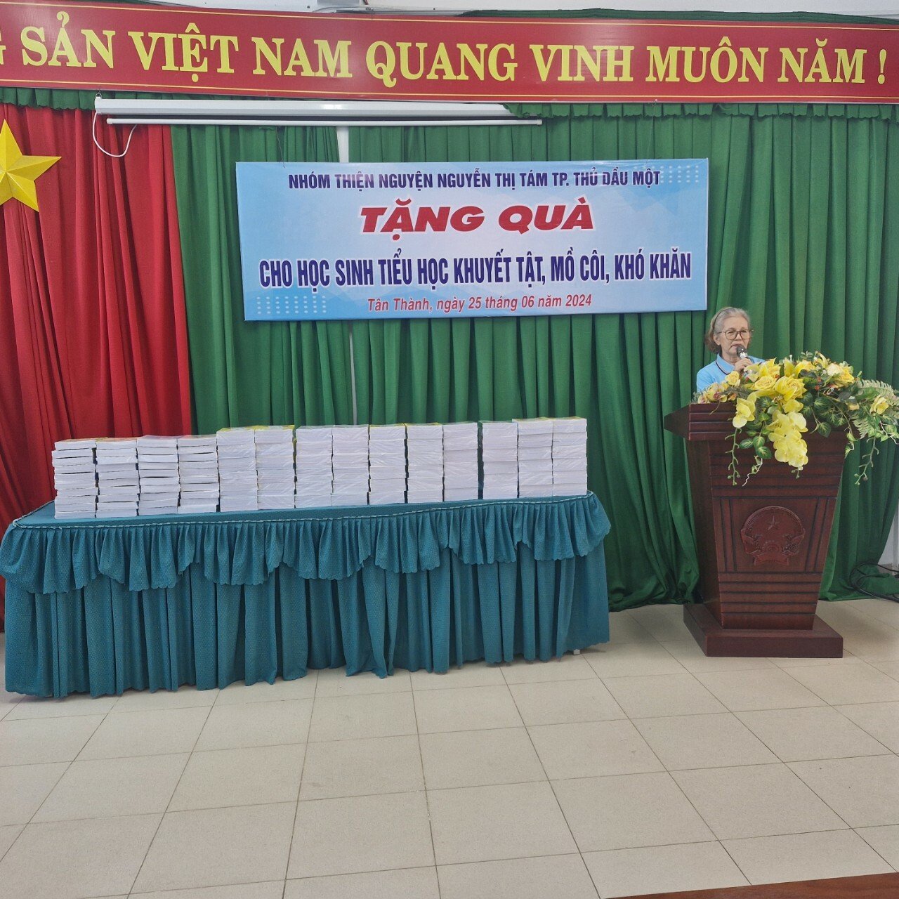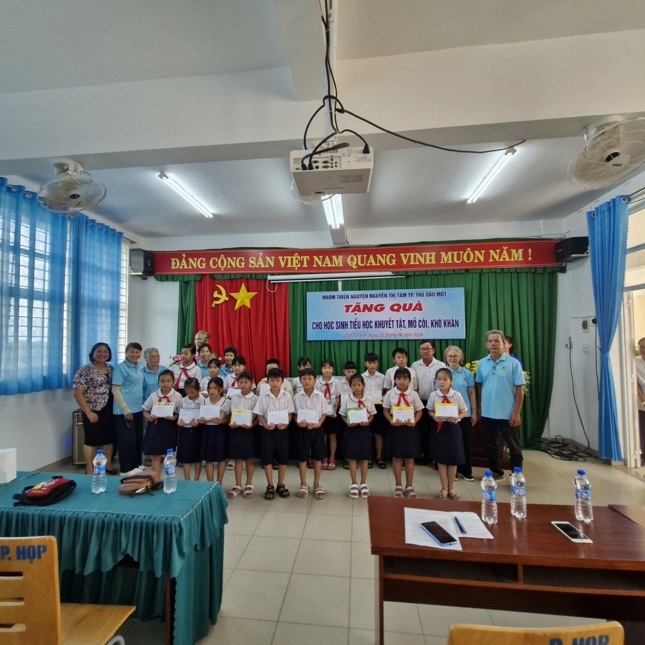 Tại đây, Nhóm thiện Nguyện Nguyễn Thị Tám, thành phố thủ Dầu Một đã trao tặng 80 phần quà và 800 quyển tập cho các em học sinh tiểu học có hoàn cảnh khó khăn, khuyết tật, mồ côi trên địa bàn huyện, mỗi phần quà trị giá 300.000 đồng.