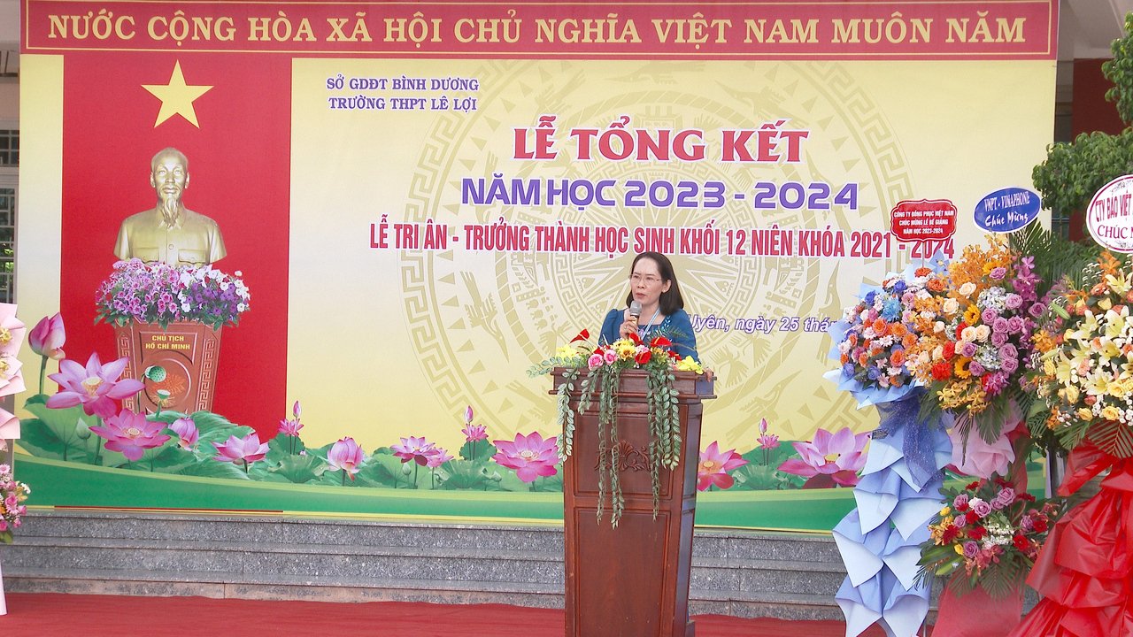 Sáng ngày 26/5, Trường THPT Lê Lợi huyện Bắc Tân Uyên đã tổ chức Lễ tổng kết năm học 2023 - 2024, tri ân và trưởng thành học sinh Khối 12 niên khóa 2021 - 2024. Tham dự Lễ có cô Nguyễn Thị Tuyết – Phó trưởng Phòng GD&ĐT huyện; lãnh đạo thị trấn Tân Thành; Ban đại diện phụ huynh học sinh và tập thể giáo viên, học sinh trường THPT Lê Lợi.