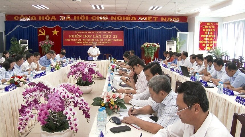 Sáng 30/3, UBND huyện BắcTân Uyên tổ chức phiên họp lần thứ 23 thông qua báo cáo tình hình kinh tế - xãhội, quốc phòng - an ninh quý I và phương hướng quý II năm 2023. Ông Thái ThanhBình - TUV, Bí thư Huyện uỷ, CT.UBND huyện chủtrì phiên họp, dự phiên họp còn có lãnh đạo các cơ quan, đơn vị thuộc huyệnCT.UBND các xã, thị trấn.
