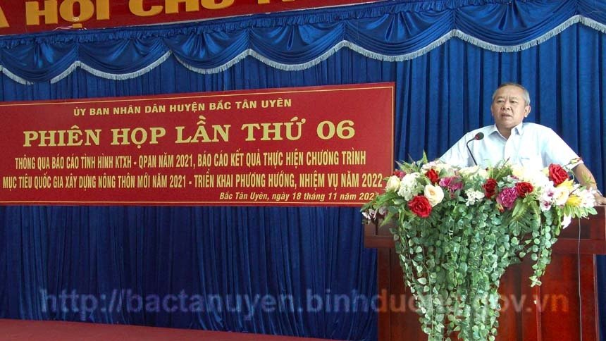 Sáng ngày 18-11, Ủy ban nhân dân huyện Bắc Tân Uyên tổ chức phiên họp lần thứ 6 nhằm đánh giá tình hình kinh tế-xã hội, quốc phòng-an ninh; kết quả thực hiện Chương trình mục tiêu Quốc gia xây dựng nông thôn mới năm 2021 triển khai phương hướng, nhiệm vụ năm 2022. Ông Thái Thanh Bình - Bí thư Huyện ủy, Chủ tịch UBND huyện chủ trì phiên họp. Cùng dự phiên họp có ông Lê Văn Quý - Phó Chủ tịch Hội đồng nhân dân huyện, lãnh đạo các cơ quan là thành viên của UBND huyện, lãnh đạo các xã, thị trấn trên địa bàn huyện.