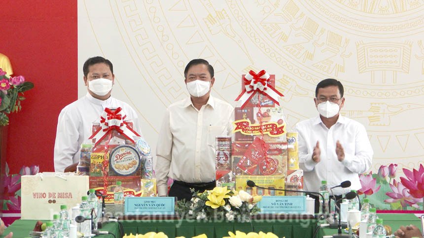 Trong không khí vui tươi chuẩn bị đón Tết nhân dịp Tết Nguyên đán Nhâm Dần 2022, Linh mục Nguyễn Văn Quốc và các vị trong Ủy ban Đoàn kết Công giáo huyện thay mặt toàn thể đồng bào theo đạo Công giáo trên địa bàn huyện Bắc Tân Uyên gửi lời chúc mừng năm mới đến Lãnh đạo và toàn thể CBCC các cơ quan huyện, chúc lãnh đạo, chính quyền sang năm mới với quyết tâm cao thực hiện hoàn thành các mục tiêu chính trị đề ra góp phần thực hiện thắng lợi Nghị quyết Đại hội Đảng bộ huyện Bắc Tân Uyên lần thứ XII và Nghị quyết Đại hội Đảng toàn quốc lần thứ XIII, nhiệm kỳ 2020-2025.