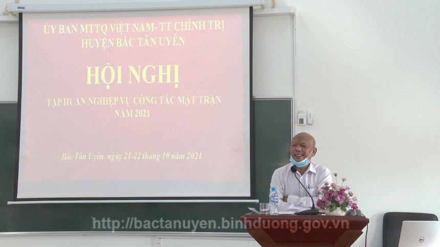 Ngày 21-10, Uỷ ban MTTQ Việt Nam huyện Bắc Tân Uyên phối hợp với Trung tâm Bồi dưỡng Chính trị huyện khai giảng lớp tập huấn, bồi dưỡng công tác Mặt trận năm 2021 cho hơn 80 học viên là Ban Thường trực Ủy ban Mặt trận Tổ quốc Việt Nam các xã, thị trấn; Trưởng Ban Công tác Mặt trận ở các ấp, khu phố trên địa bàn huyện. Đồng chí Nguyễn Huỳnh Đình - Phó Chủ tịch Ủy ban MTTQ Việt Nam tỉnh Bình Dương về dự và triển khai các nội dung đến cán bộ Mặt trận cở sở.