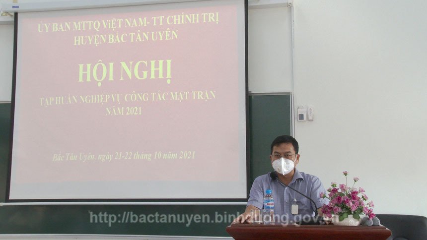 Ngày 21-10, Uỷ ban MTTQ Việt Nam huyện Bắc Tân Uyên phối hợp với Trung tâm Bồi dưỡng Chính trị huyện khai giảng lớp tập huấn, bồi dưỡng công tác Mặt trận năm 2021 cho hơn 80 học viên là Ban Thường trực Ủy ban Mặt trận Tổ quốc Việt Nam các xã, thị trấn; Trưởng Ban Công tác Mặt trận ở các ấp, khu phố trên địa bàn huyện. Đồng chí Nguyễn Huỳnh Đình - Phó Chủ tịch Ủy ban MTTQ Việt Nam tỉnh Bình Dương về dự và triển khai các nội dung đến cán bộ Mặt trận cở sở.