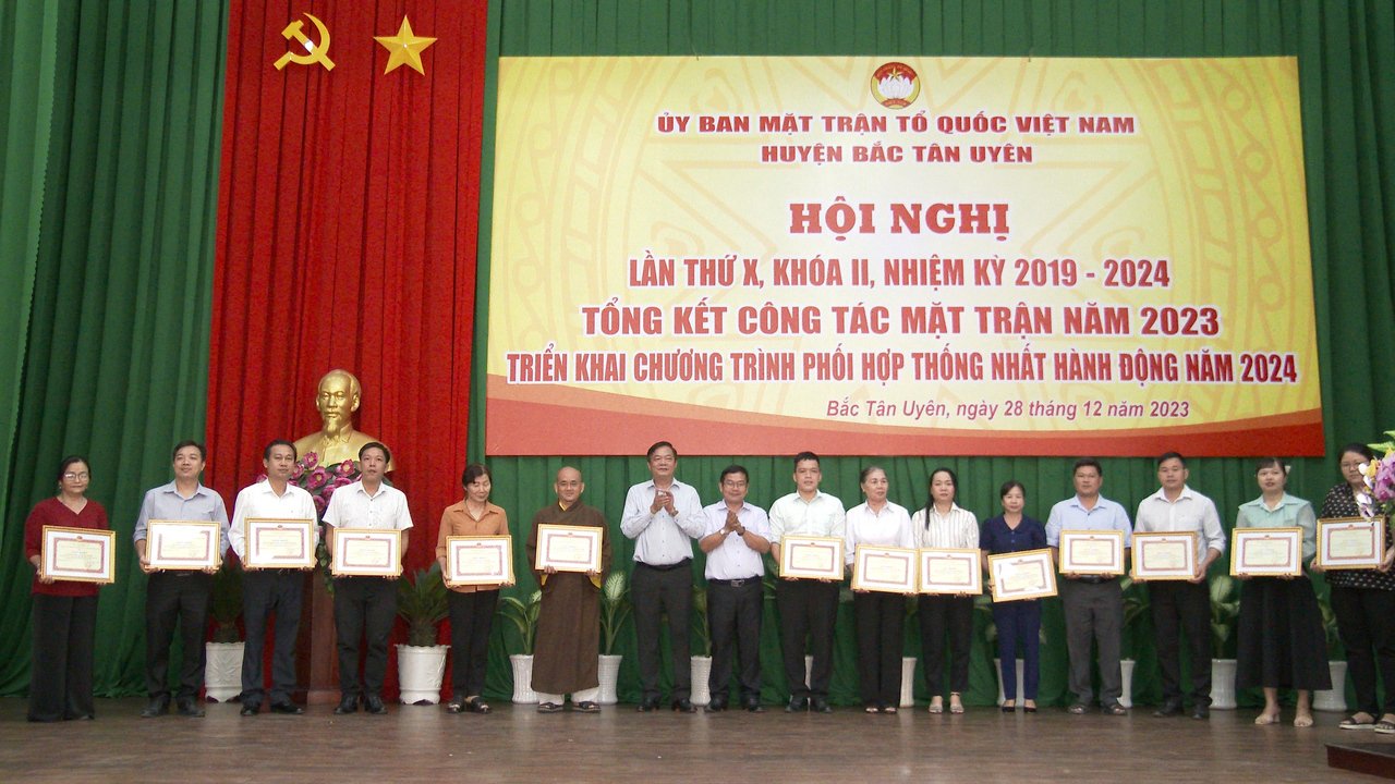Kết thúc hội nghị, BTC đã trao Bằng khen của UB MTTQ tỉnh cho 7 tập thể và 7 cá nhân có thành tích xuất sắc trong công tác mặt trận năm 2023 và trao giấy khen của Chủ tịch UBND huyện cho 16 tập thể và 16 cá nhân.
