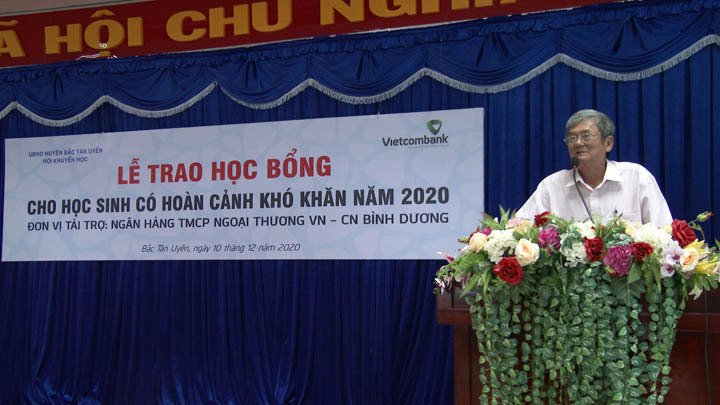 Phát biểu tại lễ trao học bổng, ông Phạm Văn Trưởng - Chủ tịch Hội Khuyến học huyện đã cảm ơn Ngân hàng TMCP Ngoại thương Việt Nam - Chi nhánh Bình Dương (Vietcombank Bình Dương) đã quan tâm hỗ trợ giúp cho các em học sinh có hoàn cảnh khó khăn của huyện để các em có thêm điều kiện trong học tập; đồng thời, mong các em học sinh được nhận học bổng hãy cố gắng học tập, rèn luyện xứng đáng là con ngoan, trò giỏi để không phụ lòng sự quan tâm của đơn vị tài trợ, lãnh đạo huyện.
