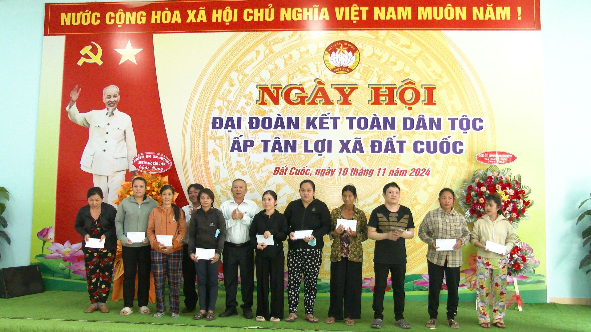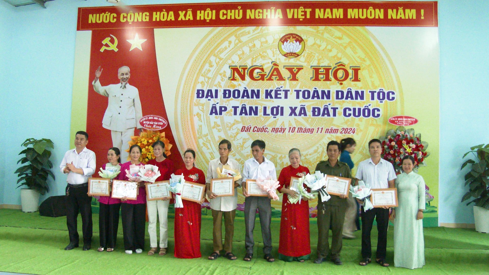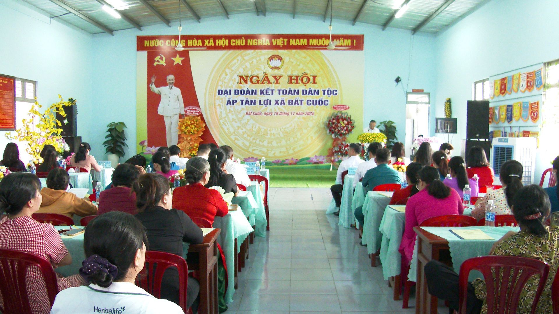 Tại Ngày hội, các đại biểu và Nhân dân ấp Tân Lợi đã cùng nhau ôn lại truyền thống 94 năm Ngày thành lập Mặt trận thống nhất Việt Nam 18/11/1930-18/11/2024; báo cáo kết quả thực hiện nhiệm vụ xây dựng khối đại đoàn kết toàn dân tộc; kết quả phát triển kinh tế, văn hóa, xã hội; kết quả thực hiện các cuộc vận động, phong trào thi đua yêu nước của địa phương năm 2024. Qua báo cáo cho thấy, trong năm, Ban vận động ấp Tân Lợi, xã Đất Cuốc đã tích cực tổ chức tuyên truyền, vận động Nhân dân tham gia xây dựng gia đình văn hóa, gia đình hiếu học; đoàn kết phát triển kinh tế, giúp nhau giảm nghèo bền vững, làm giàu chính đáng; đoàn kết xây dựng đời sống văn hóa, bảo vệ môi trường, chấp hành pháp luật, bảo đảm trật tự an toàn xã hội. Trong năm, ấp đã vận động Quỹ vì người nghèo được hơn 9 triệu đồng, Quỹ bảo trợ trẻ em hơn 4 triệu đồng, vận động ủng hộ đồng bào miền Bắc bị ảnh hưởng bão số 3 hơn 34 triệu đồng; vận động xã hội hóa xây dựng cơ sở vật chất phục vụ đời sống tinh thần và cảnh quan địa phương với tổng kinh phí hơn 36 triệu đồng. Vận động 100% hộ đăng ký danh hiệu gia đình văn hóa. Qua bình xét cuối năm có 143/143 hộ được công nhận gia đình văn hóa, đạt tỷ lệ 100%.