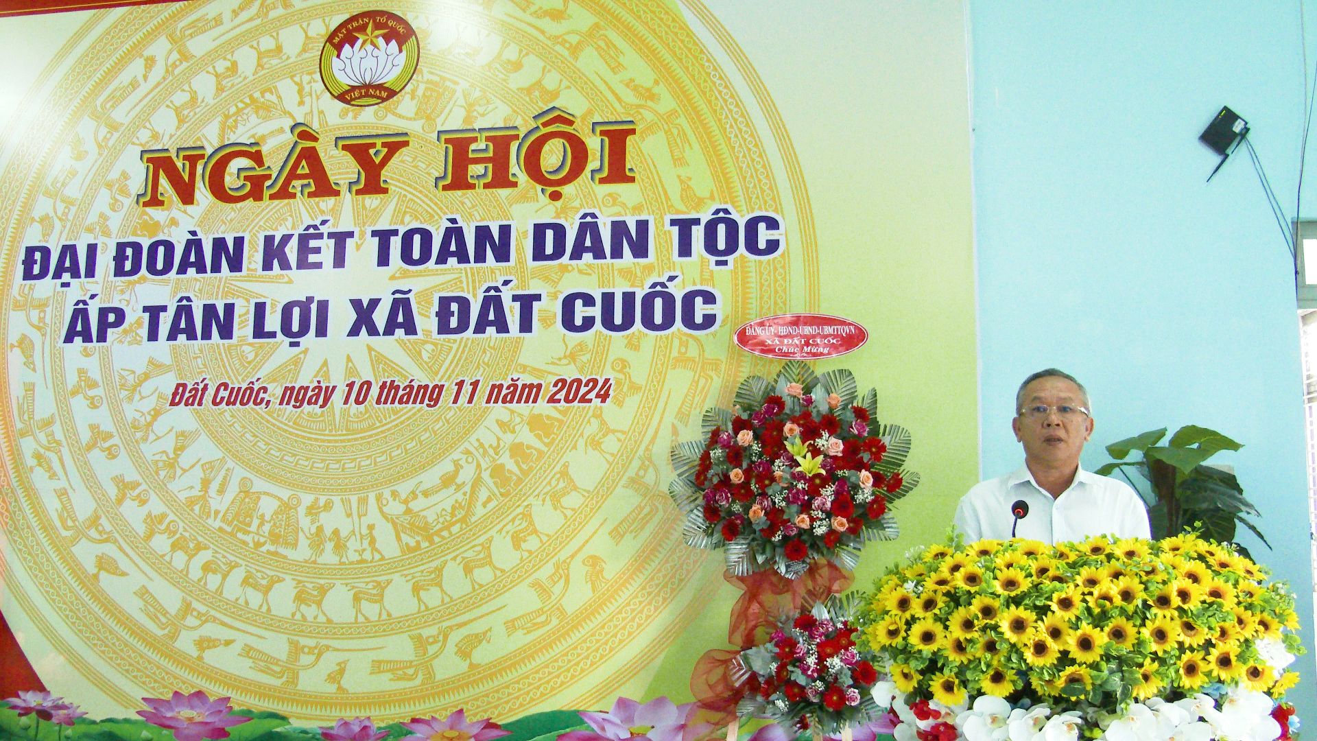 Dự và phát biểu tại ngày hội, ông Thái Thanh Bình - Tỉnh ủy viên - Bí thư Huyện ủy ghi nhận, biểu dương những đóng góp, nỗ lực và cố gắng của Chi bộ, Ban điều hành, Ban công tác Mặt trận, các chi tổ hội và nhân dân ấp Tân Lợi đã cộng đồng trách nhiệm, đóng góp sức lực, tinh thần để xây dựng và củng cố khối đại đoàn kết toàn dân tộc, phát triển kinh tế, đảm bảo an ninh trật tự. Đồng thời, mong muốn trong thời gian tới, Cấp ủy Chi bộ, Ban công tác Mặt trận, Ban vận động cùng các đoàn thể tiếp tục phát huy tinh thần đoàn kết, nâng cao chất lượng và thực hiện tốt các cuộc vận động, các phong trào thi đua, nâng cao đời sống vật chất, tinh thần của người dân, giữ vững ấp văn hóa.