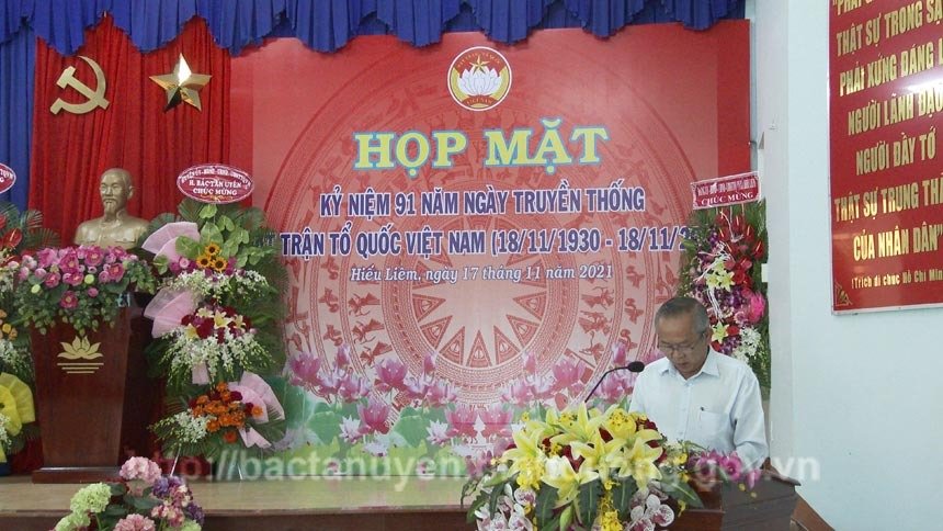 Nhân kỷ niệm 91 năm Ngày truyền thống Mặt trận Tổ quốc Việt Nam (18/11/1930-18/11/2021), sáng ngày 17-11, ông Võ Văn Bá – Ủy viên Thường vụ, Trưởng Ban nội Chính Tỉnh ủy đã đến dự Ngày hội Đại đoàn kết toàn dân tộc tại xã Hiếu Liêm. Cùng dự Ngày hội có ông Thái Thanh Bình – Tỉnh Ủy viên, Bí thư Huyện ủy, Chủ tịch UBND huyện và các ông bà đại diện cho Ủy ban MTTQ Việt Nam tỉnh, huyện, đại diện lãnh đạo UBND xã Hiếu liêm, Cấp ủy Chi bộ, Ban Công tác Mặt trận các ấp và đại diện các hộ gia đình trên địa bàn xã.