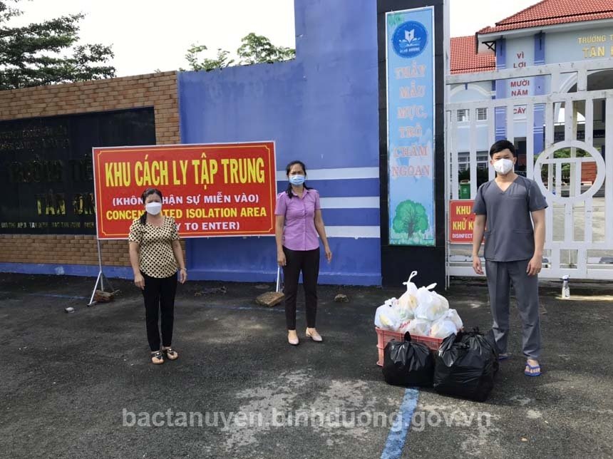 Đại diện MTTQ xã Tân Định trao các phần quà cho Khu cách ly tập trung Trường tiểu học Tân Định